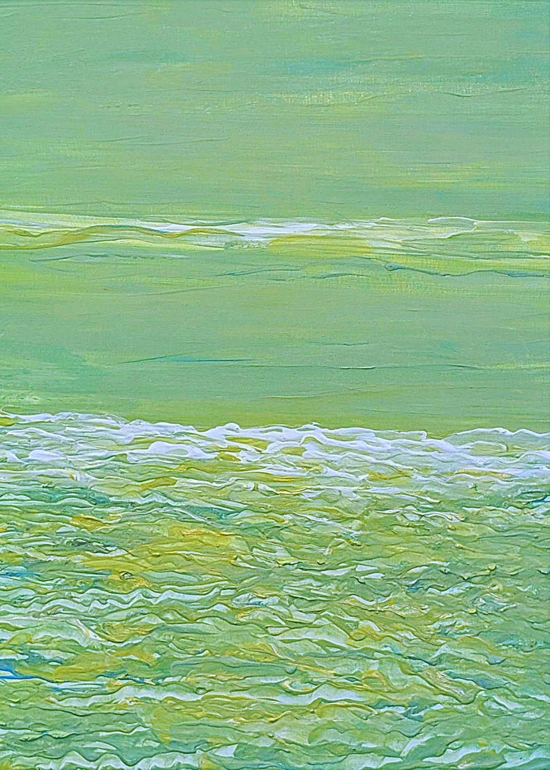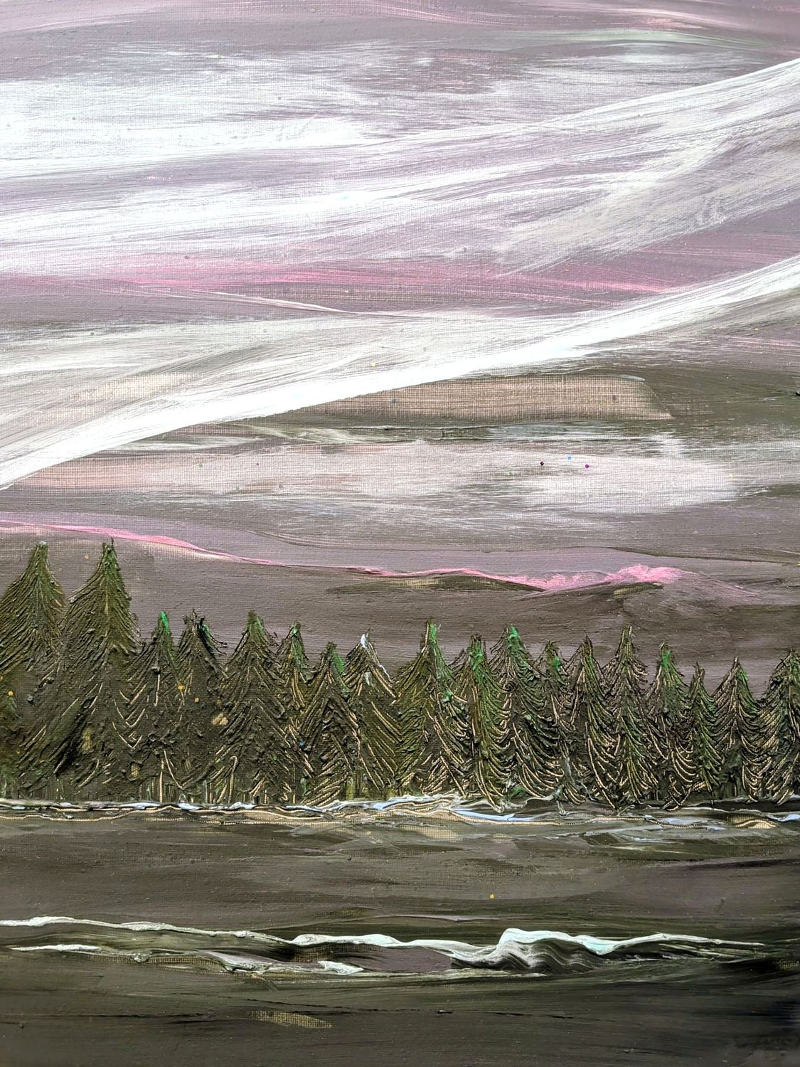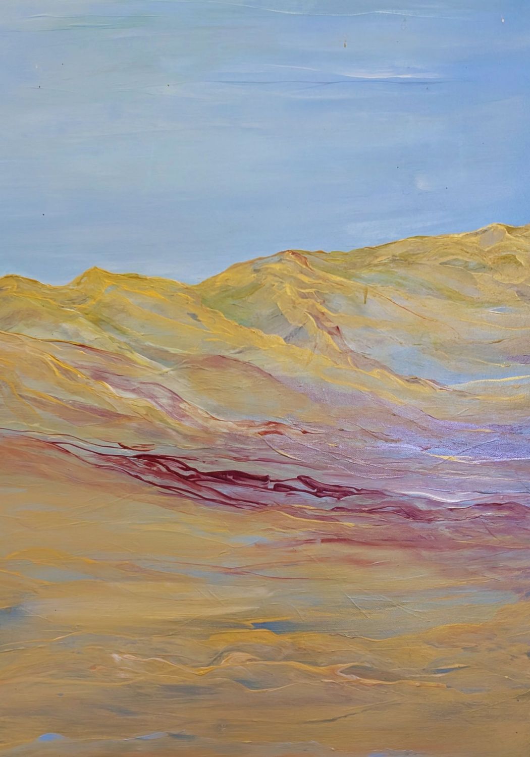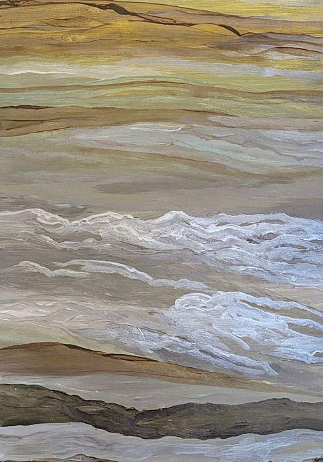 Pastellfarbene Acrylfarben gemischt und in Schichten aufgetragen, ergänzt durch dunkles Braun, Grau und Blau, harte und weiche Pinsel in verschiedenen Materialien und Stärken.
